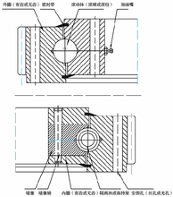 這種開式裝配非常方便,上下圓弧滾道的承載角都為90°,能承受很大的軸向力和傾翻力矩。當徑向力大于0.1倍的軸向力時滾道須特殊設計。雙排球式回轉(zhuǎn)支承的軸向、徑向尺寸都比較大,結(jié)構(gòu)堅固,特別適用于要求中等以上直徑的塔式起重機、汽車起重機等裝卸機械上。
